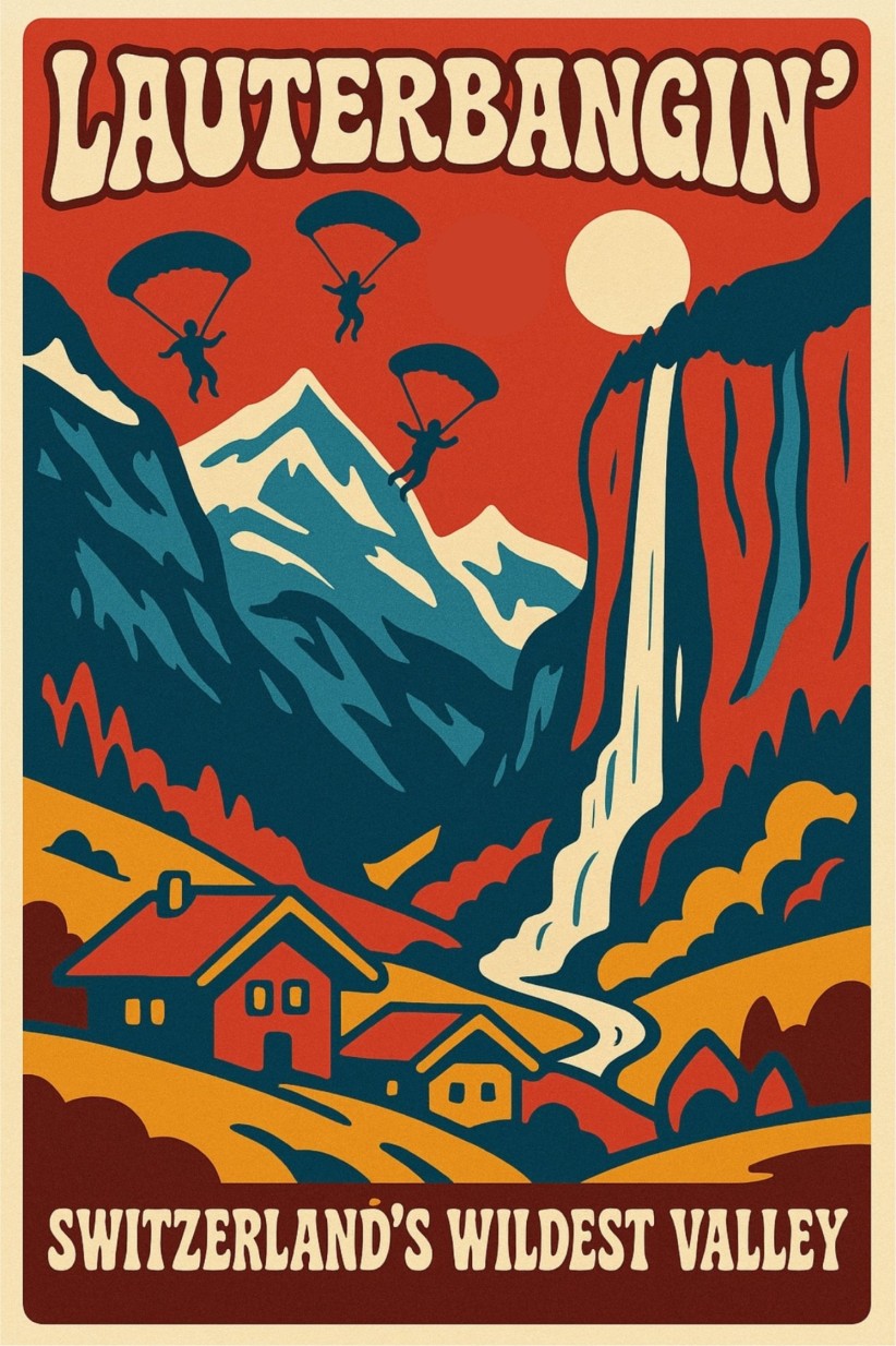 Lauterbangin' is a lifestyle brand born at the altar of Lauterbrunnen's cliffs—where BASE jumpers find their religion in freefall and tourists stumble into their first "holy shit" moment, gazing up at the grinning fangs of the skyline as a parachute cracks open overhead.